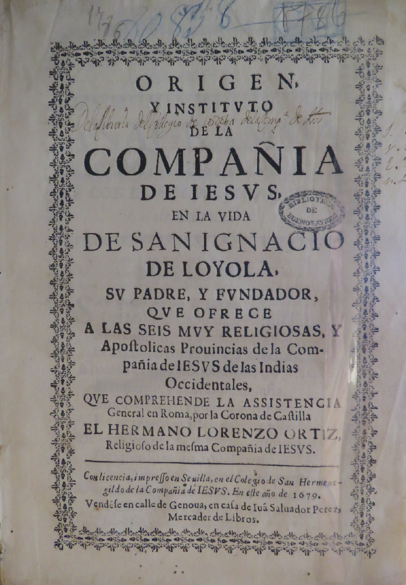 Origen y instituto de la Compañía de Iesus en la vida de San Ignacio de Loyola (…)Lorenzo OrtizSevilla, 1679BN B264