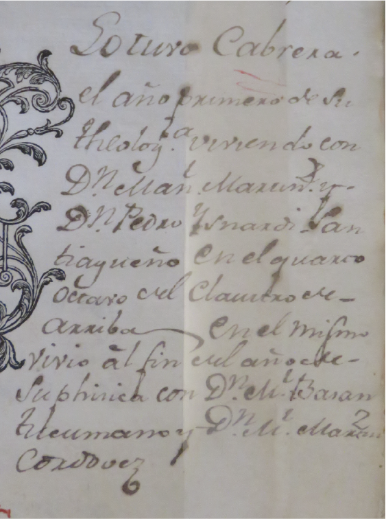 “Lo tuvo Cabrera el año primero de su teológica viviendo con Don Manuel Martínez y Don Pedro Isnardi, santigüeño en el cuarto octavo del claustro de arriba en el mismo vivió al fin del año de su phisica con Don Manuel Bazán tucumano y Don Manuel Martinez cordovez”